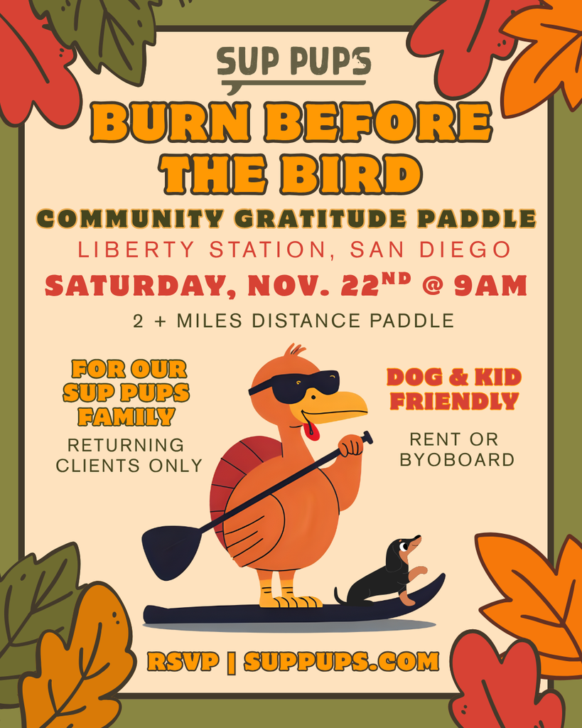 Come enjoy the calm of the bay, the company of friends, and that special pre-holiday energy that reminds us how grateful we are for this incredible SUP Pups community. Let’s make some waves, share some smiles, and start the Thanksgiving week off right.